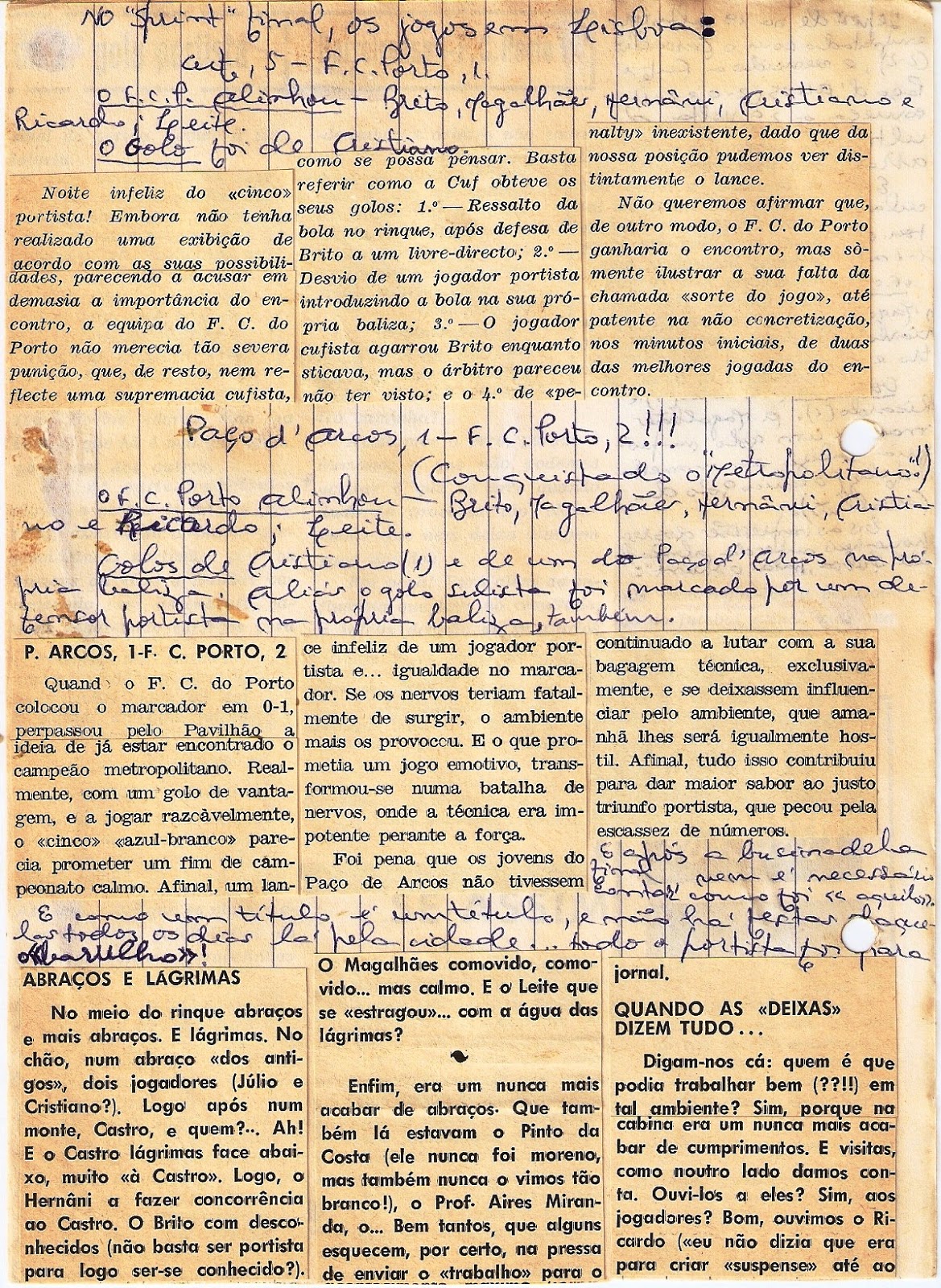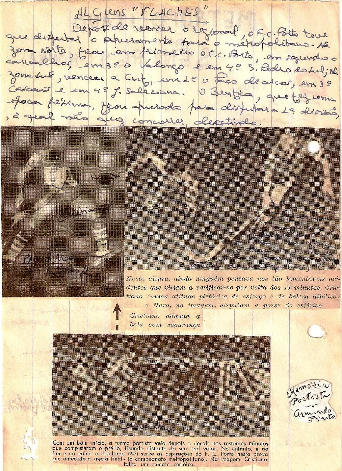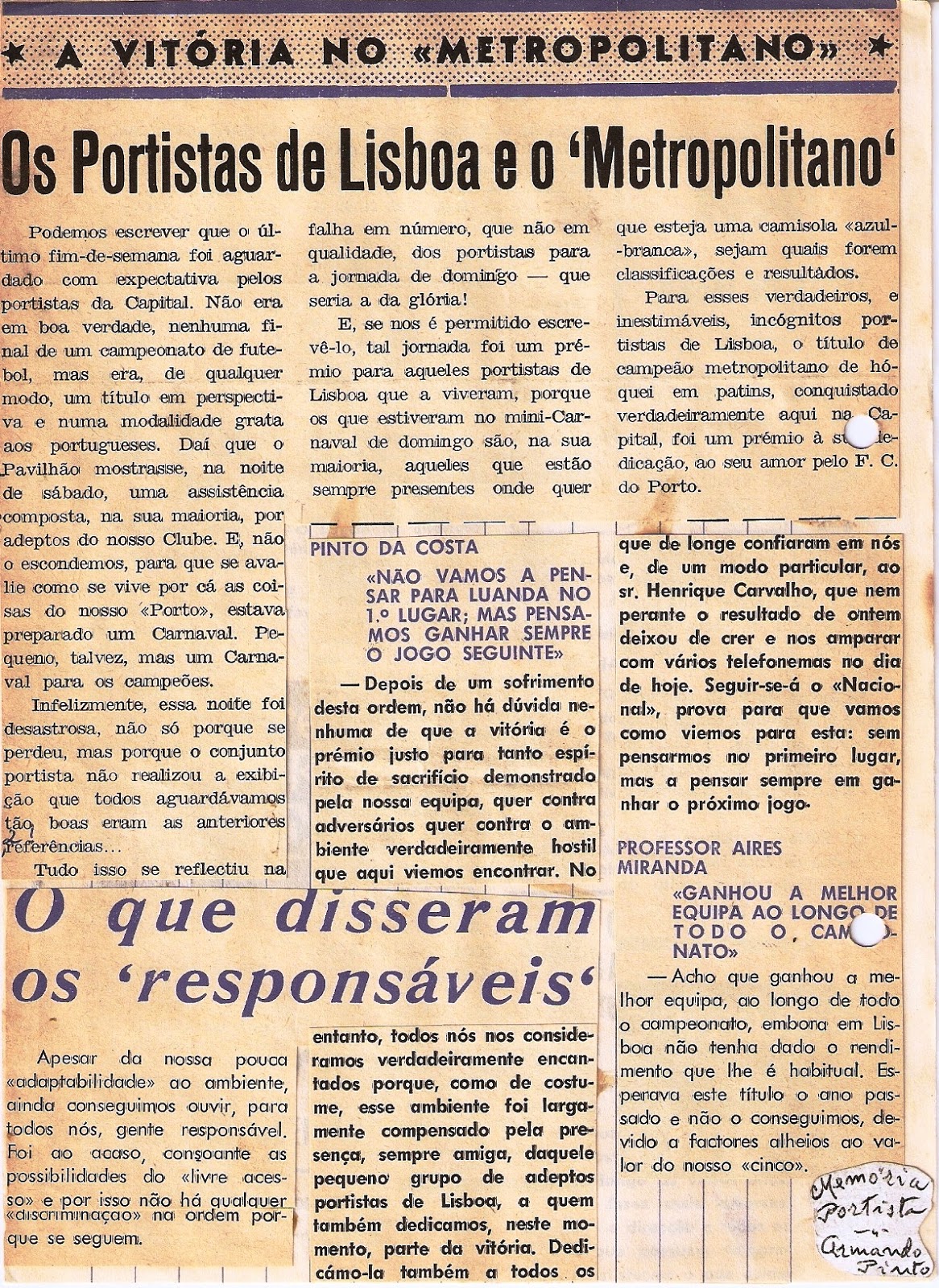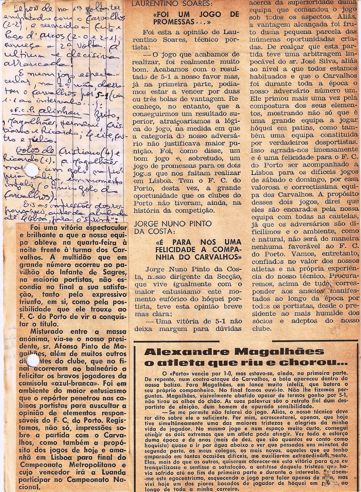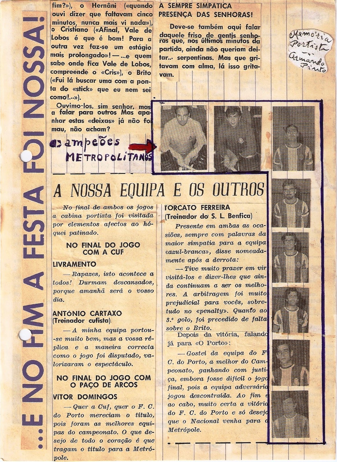 Dessa grande epopeia pode reter-se algo mais através do que ficou registado, nesse tempo, pelo punho do autor destas linhas, ao tempo ainda jovem adepto entusiasta do hóquei azul e branco, por entre o que sentia no portismo que corria nas veias e saía pelos poros da pele. Embora, no caso dos registos anotados, naturalmente ressalvando as condicionantes da época e a erosão do tempo. Por meio de cujas páginas, então retiradas dos cadernos escolares e metidas em pasta de argolas, se avivam sensações e quase que ainda se consegue conviver com protagonistas (então conhecidos apenas de nomes e fisionomias pelas imagens dos jornais e acompanhamento pelos relatos radiofónicos, pois só mais tarde houve conhecimentos pessoais) mais acontecimentos vividos intensamente, numa linha cronológica que acompanha a alegria sentida, também.