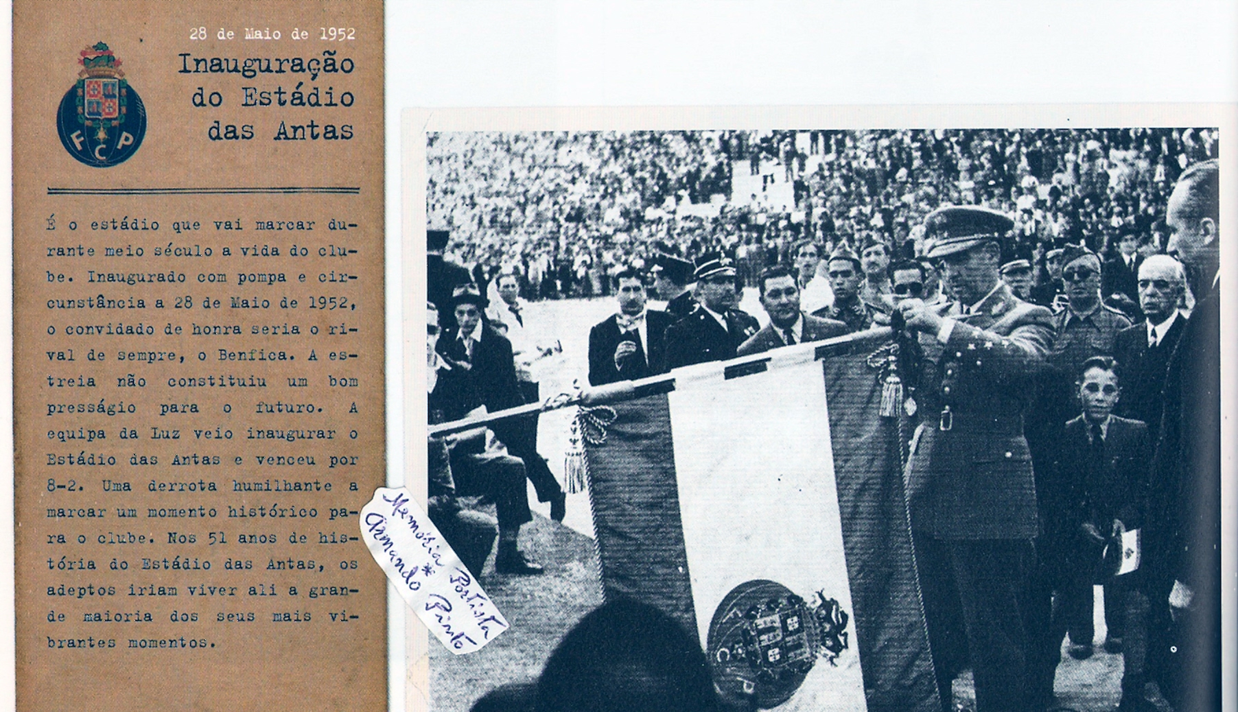 Pois… Aos 28 dias do mês de maio do ano de mil novecentos e cinquenta e dois era solenemente inaugurado o estádio das Antas, oficialmente chamado Estádio do Futebol Clube do Porto. Tendo presidido ao cerimonial o então Presidente da República, General Francisco Higino Craveiro Lopes, aproveitando sua segunda vinda e primeira visita oficial à cidade do Porto após ser investido como Chefe do Estado, então para visitar e inaugurar algumas obras na cidade. Conforme se pode ler no livro “Notícia político-biográfica do General Craveiro Lopes 11º Presidente da República Portuguesa”, da autoria de Zuzarte de Mendonça Filho e publicado em Lisboa em 1954. No qual se encontra uma foto sugestiva, da admiração de Craveiro Lopes pela imponência do estádio portista.