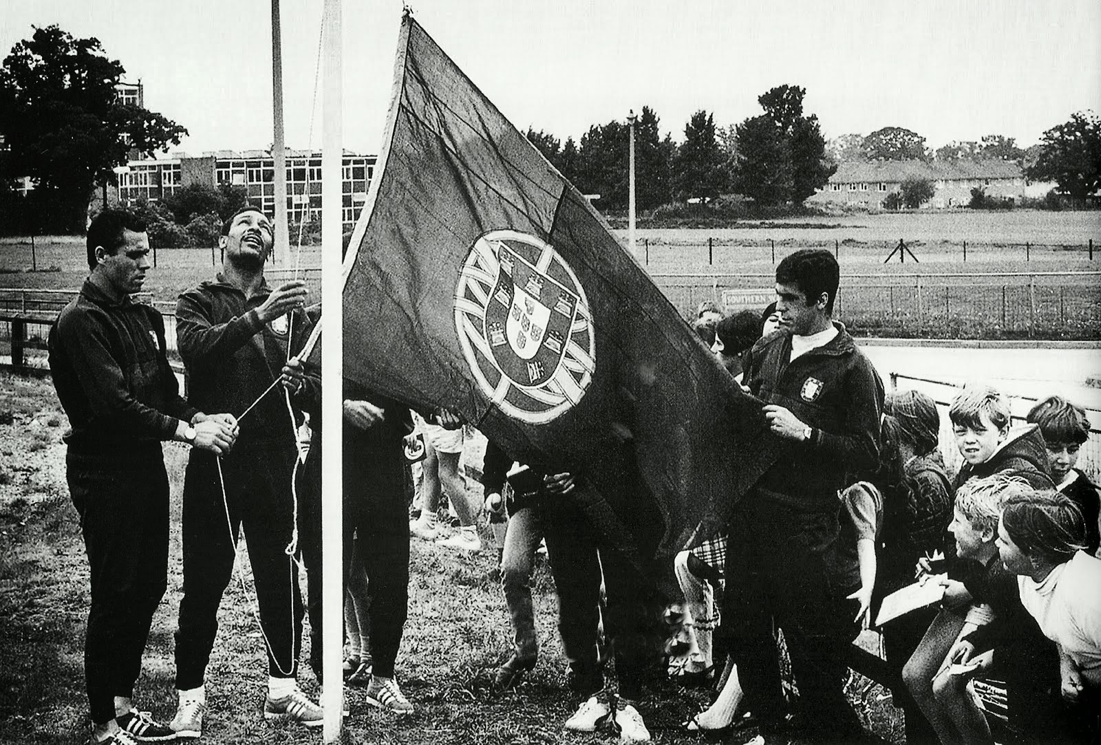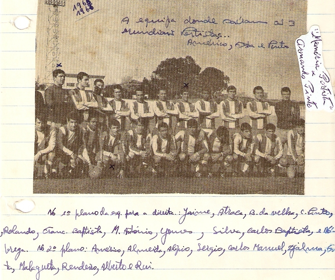 = “Magriços de 1966” em Inglaterra – estando Festa à direita, em pé; e, em baixo, Américo (o mais próximo da frente) e Pinto (em penúltimo da segunda fila da imagem) respetivamente, também à direita, do primeiro plano.