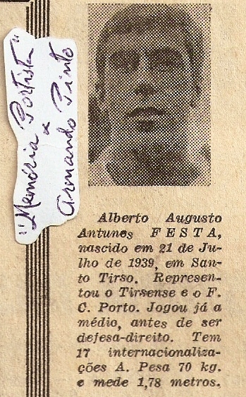 A 21 de Julho de 1939 nasceu Festa, o defesa-direito Alberto FESTA que foi o único portista a atuar pela seleção portuguesa no Mundial de 1966. Ou seja o que acabou por jogar na fase final do Campeonato do Mundo de Futebol disputado na Inglaterra em 1966, intrometido entre os protegidos do regime, nesse tempo do sistema BSB, em que a Federação Portuguesa de Futebol era presidida à vez só por dirigentes de Benfica, Sporting e Belenenses… Tendo Festa feito 3 jogos dos 6 que a seleção da camisola das quinas disputou nesse Mundial da velha Albion (enquanto o guarda-redes Américo, que até tinha a camisola n.º1 dos 22 Magriços, e durante a época havia recebido prémios oficiais por seu valor, foi posto de lado para jogar José Pereira do Belenenses, de modo a que a presidência do Belenenses tivesse melhor representação por junto com Vicente… E Custódio Pinto idem aspas, ele que até era polivalente, também ficou no banco para jogarem médios e atacantes de Sporting e Benfica… Tudo na linha BSB. Com o cúmulo do único utilizado sem ser do sistema, ou seja de Benfica, Sporting e Belenenses, de Lisboa, e além do único do FC Porto que teve essa possibilidade, haver sido um do Vitória de Setúbal, Jaime Graça, porque então estava já adquirido pelo Benfica).