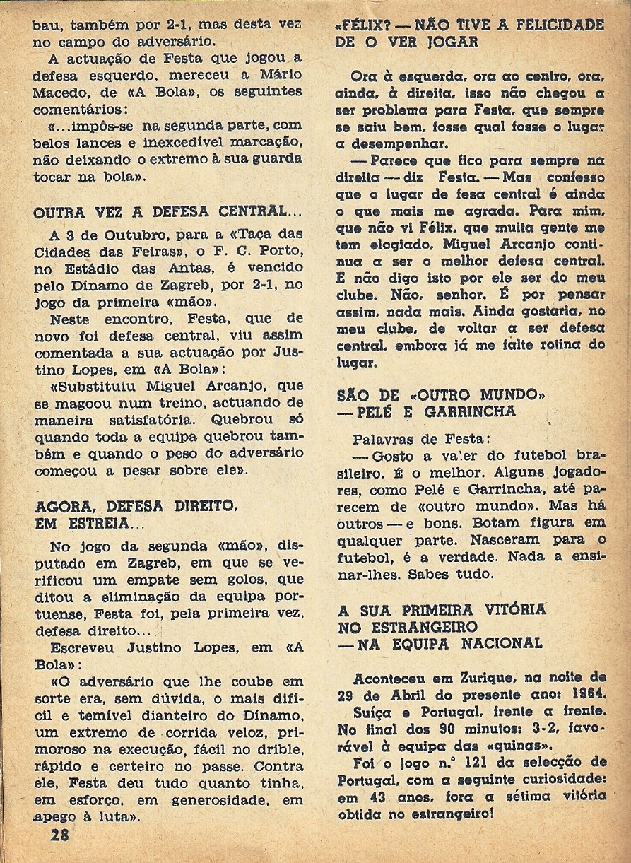 Festa era então o capitão de equipa do FC Porto e defesa que substituíra dignamente o célebre Virgílio Mendes. Mas, após o Mundial, pouco mais conseguiu jogar, pois em 1967/68 sofreu uma grave lesão que o obrigou a interromper seu percurso no futebol e acabou por o afastar até dos grandes palcos do desporto-rei.
