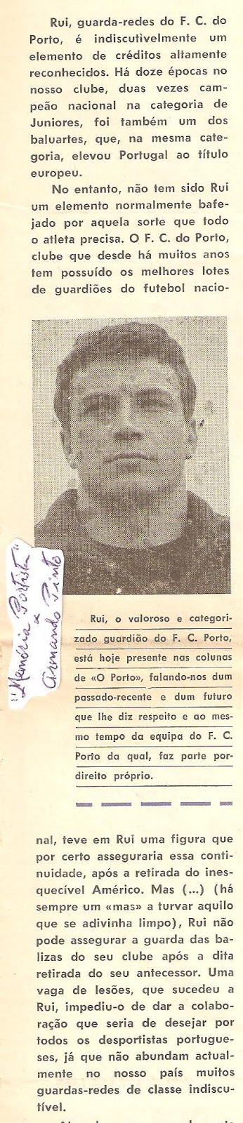Tal o que aqui recordamos desta feita, lembrando o caso do guarda-redes Rui, que em sua longa carreira desportiva foi um segundo guarda-redes de luxo do FC Porto durante muitos anos, enquanto suplente da equipa principal do futebol portista. Sendo ao longo de sua vida futebolística no escalão sénior, sempre como elemento do FC Porto, muito apreciado pela sua fidelidade clubista.