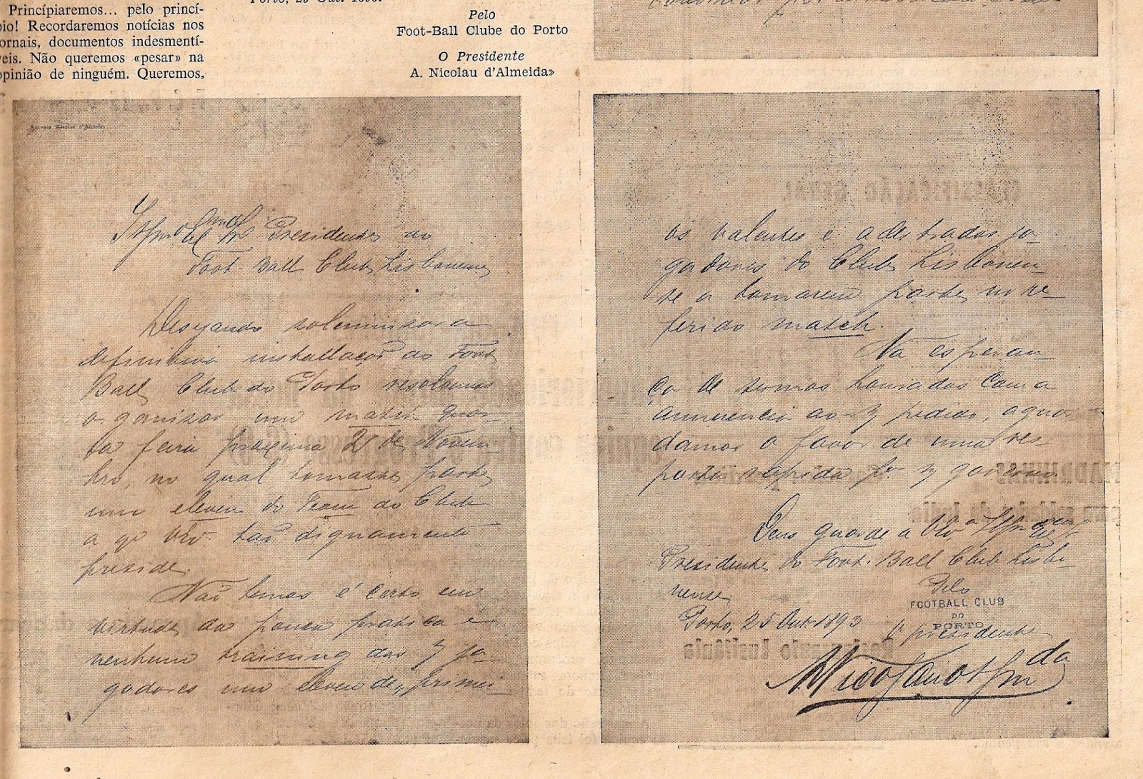 Nesta data, em 2023, comemorativa da passagem de 130 anos de existência do Futebol Clube do Porto, quando se assinala no mundo portista a Fundação do FC Porto em 1893, ressaltam aos sentidos da memória algumas curiosidades relacionadas com o conhecimento do facto e devida reposição histórica. Sabendo-se que quando Rodrigues Teles escreveu a História do FC Porto (em fascículos, depois agrupados em 3 volumes), ele referiu logo a existência duma carta comprovativa da criação do clube em 1893, mas não assumiu como devia a verdade, deixando ficar o que outros haviam afiançado, até com uma data errada que nem correspondia ao dia da semana que diziam ter sido. Até que a 1 de Setembro de 1952, Cândido de Oliveira, que chegou a ser treinador do FC Porto precisamente quase por essa altura (entrando nessa função nas Antas pouco depois, em Novembro), «ofereceu ao clube a famosa carta de Nicolau d’Almeida, que em outubro de 1893 desafia o Clube Lisbonense para um jogo, no que seria o primeiro jogo de futebol do FC Porto.» .