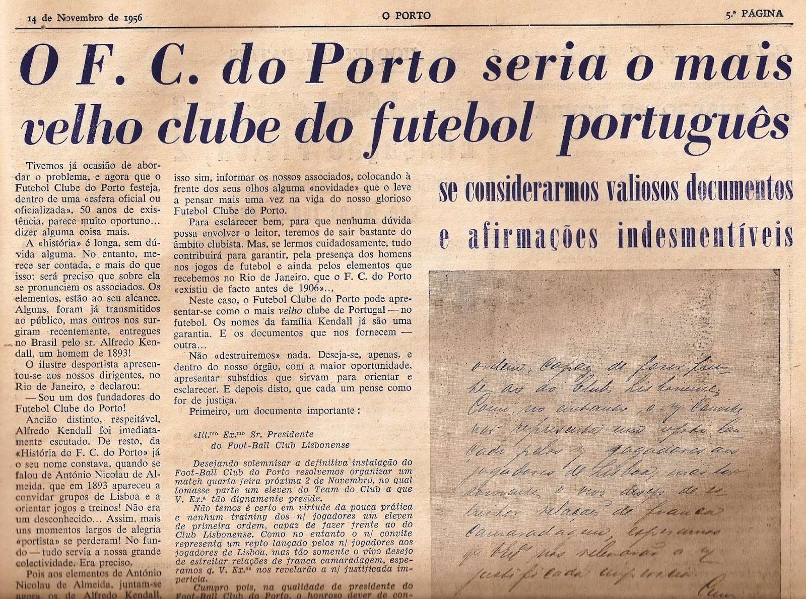 Depois disso e reforçando o assunto, em 1956 algo mais aconteceu… através dum dos fundadores de 1893, ou seja um contemporâneo e interveniente nos acontecimentos de então, por sinal um familiar antepassado de André Villas-Boas, o histórico Alfredo Kendall que fez parte das primeiras equipas do FC Porto.