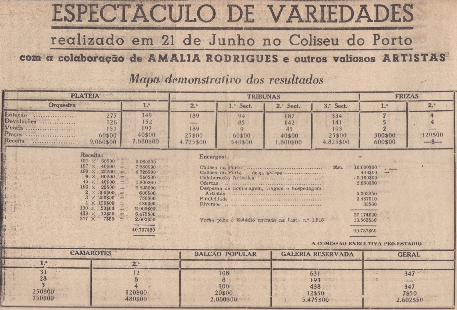 Ora, como em contas à maneira do Porto, de honestidade e transparência, desse espetáculo de 21 de junho de 1951, em que participou a rainha do fado AMÁLIA RODRIGUES e outros artistas de variedades no Coliseu do Porto, houve depois comunicado público da soma conseguida: Ficando-se a saber que o total da receita foi de 40.737$50 escudos, num bom resultado atinente à campanha pró-Estádio das Antas, no caso através dessa realização concretizada pela Comissão Executiva Pró-Estádio. Conforme posteriormente veio publicado no jornal O Porto de 31 de agosto de 1951.