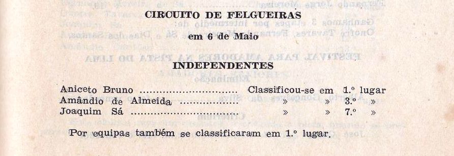 Acrescendo que na mesma realização, “com a colaboração da Associação de Ciclismo do Norte”, estiveram em disputa de ambas as vezes a Taça Câmara Municipal de Felgueiras para o vencedor individual, e outra taça para a equipa vencedora da classificação coletiva.