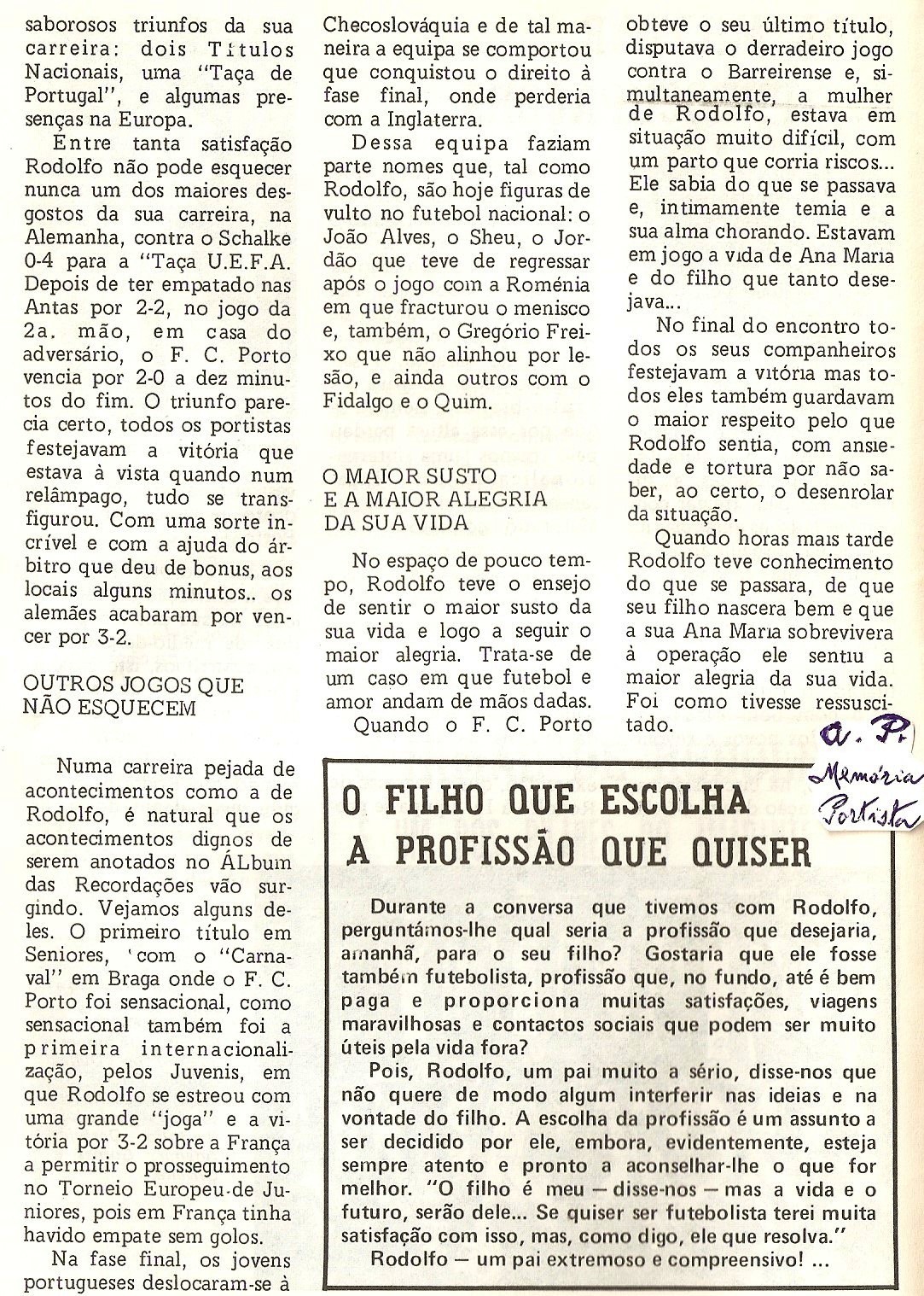 Rodolfo era, em seu tempo de atleta profissional, um dos futebolistas mais queridos no seio dos apoiantes portistas, precisamente por toda a raça que punha na defesa do clube. E continua a ser uma recordação constante, no apreço que os grandes vultos do F C Porto representam no sentimento do mundo azul e branco, em tudo quanto representa o afeto da família portista.